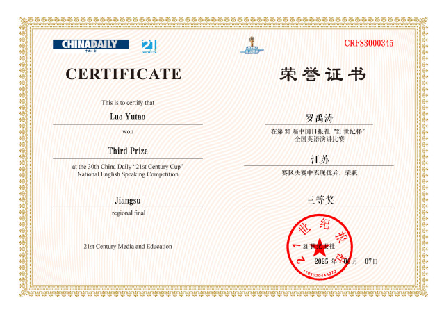6月7日,第30届中国日报社“21世纪杯”全国英语演讲比赛江苏省赛决赛在南京理工大学圆满落幕。公司选派两名优秀学子参赛,凭借出色的英语表达能力、严密的逻辑思维能力、迅速现场反应力及出色的舞台表现力,谈球吧金奕彤同学在来自南京大学、东南大学、南京理工大学等全省80名优秀参赛选手的激烈竞争中脱颖而出,荣获江苏省一等奖,顺利晋级国赛,罗禹涛荣获江苏省三等奖。金奕彤同学作为优秀选手,接受21世纪报记者视频采访。