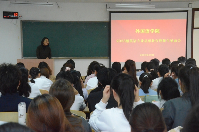 2023年10月25日下午,谈球吧举办了2023级英语专业思想教育暨师生见面会。外国语公司党委书记周珊珊、经理张秀萍、英语专业全体教师以及2023级英语专业新生参加了本次活动。见面会由副书记范迎波主持。