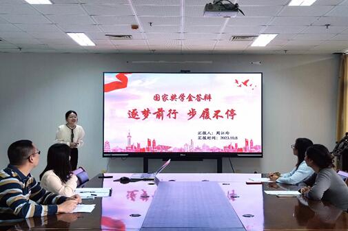 为进一步推进公司学风建设,充分发挥国家奖学金的引领作用,2023年10月8日,谈球吧在敬业楼912举办了国家奖学金评审答辩会。本次答辩会由外国语公司党委副书记范迎波、员工科郑清军、李桂莉和刘欣畅老师担任评委。